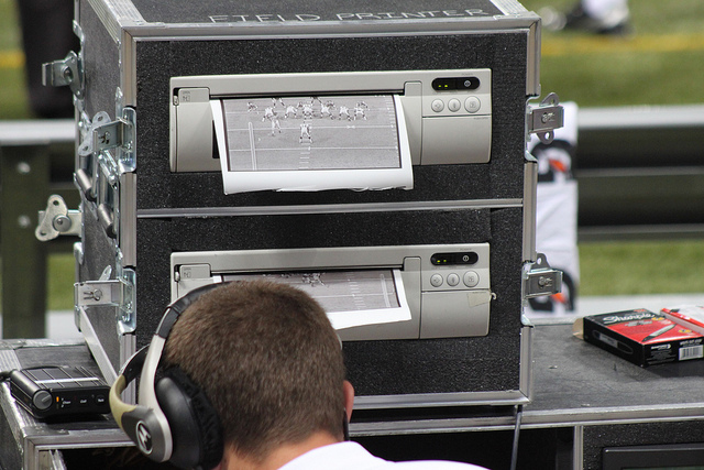 For fans who tune in to the game, it’s not uncommon to spot players on the bench flipping through binders with photos of the action on the field, photos produced by onsite printers. The images are used by the coaching staff, as seen here in a photo from the Baltimore Ravens sideline: