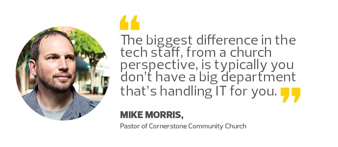 Interestingly, small and medium-sized businesses tend to have a lot in common with many churches: multiple players wearing multiple hats, trying to do a lot techwise with a little budgetwise. Morris is no different; although he’s the pastor at Cornerstone, he’s also its de facto tech leader.