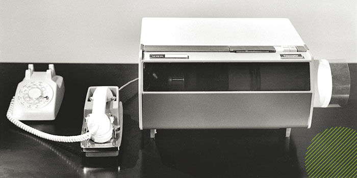 However, at 46 pounds, the Magnafax Telecopier was lighter than previous models and relatively easy to operate. Able to send images and text when connected to any standard telephone line, the Magnafax Telecopier could transmit a letter-sized document in about six minutes — an incredible feat at the time.