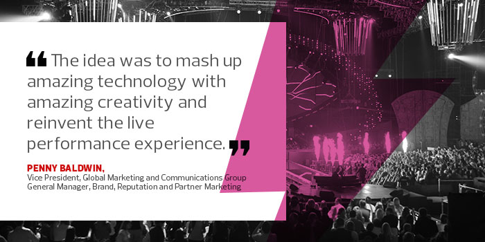 “The idea was to mash up amazing technology with amazing creativity and reinvent the live performance experience at the Grammys because it has a built-in audience and a massive social and digital following,” says Baldwin. “That in turn led to reaching out to Lady Gaga because we knew she was the type of artist that would embrace technology and really respond to the concept overall, and she did.”