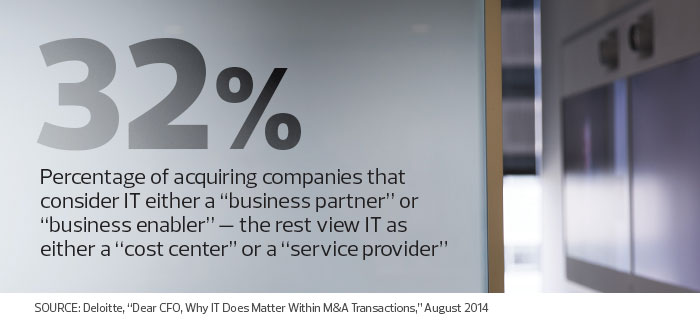 Sometimes before a merger, the IT group might be viewed as a cost center or perhaps as nonstrategic, says Will Poindexter, who has extensive experience helping companies integrate IT during mergers and acquisitions (M&A) as a partner with global management firm Bain & Co. in Washington, D.C.